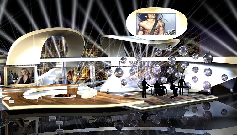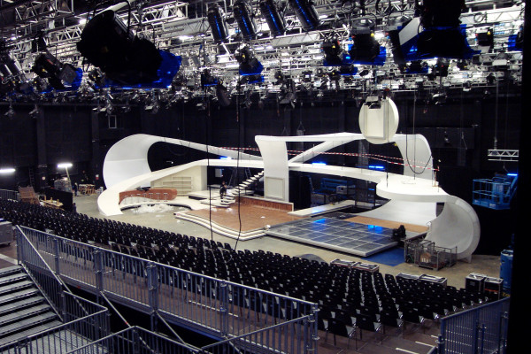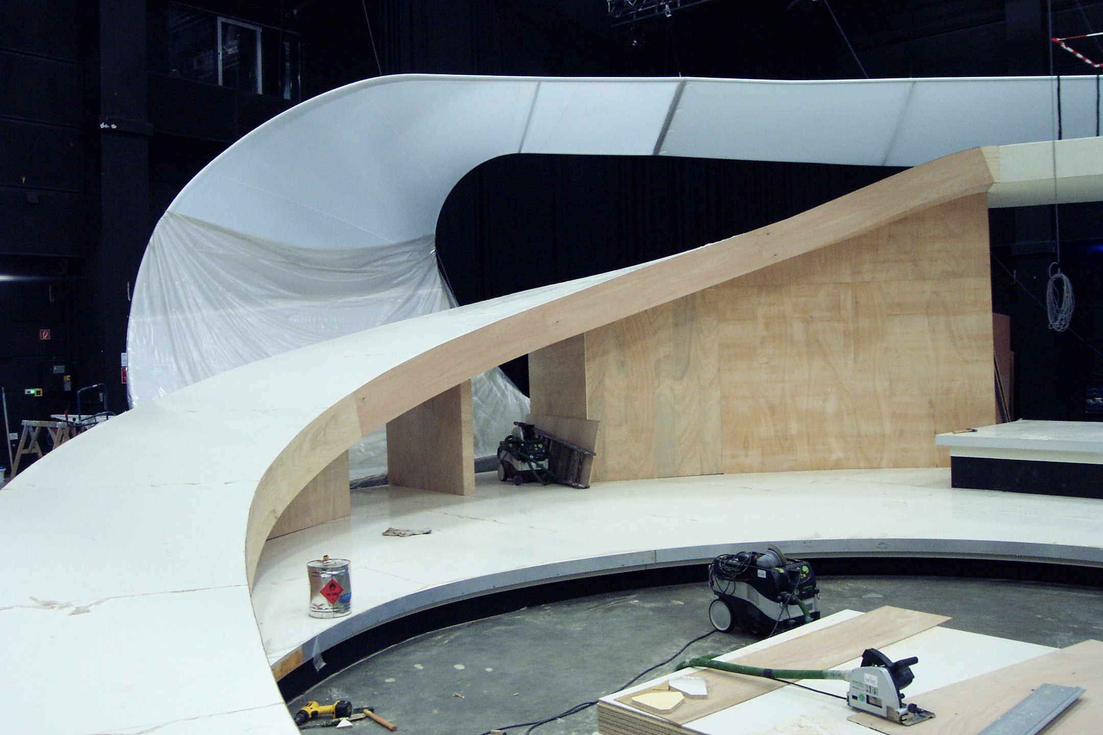Geschwungene Rampe und gedrehte Treppe für aufwendige Bühnenkonstruktion. Besonderheit: es standen nur 10 Tage Bauzeit zur Verfügung.