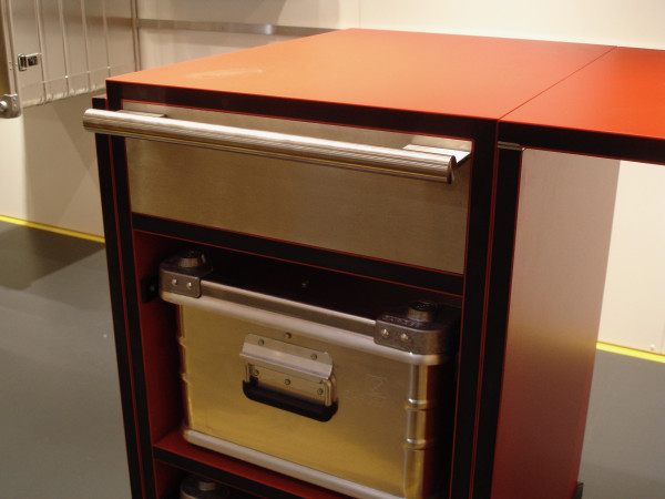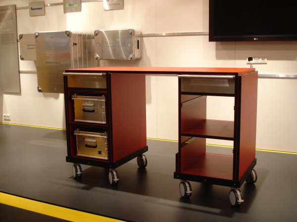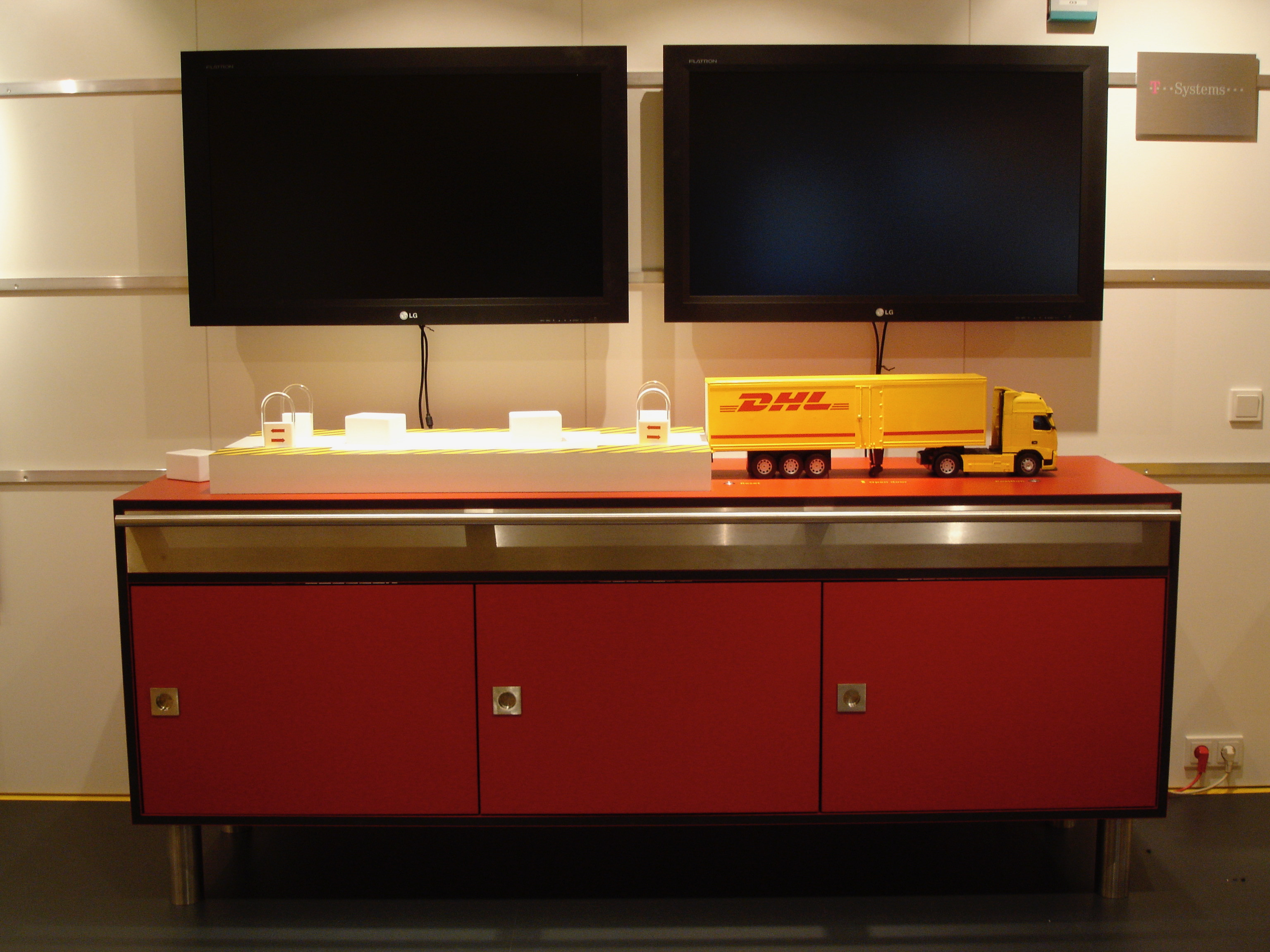Diverse Edelstahlteile für DHL Präsentationsraum in einem Fracht-Container.