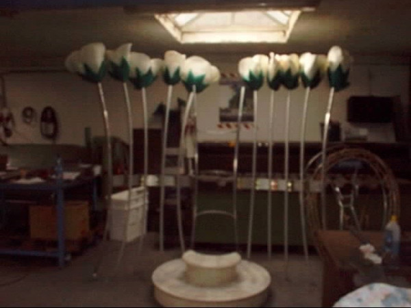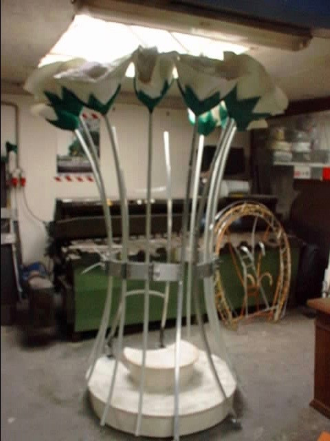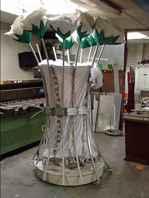 Die Schauspielerin im Inneren kann die Figur bewegen. Auf Knopfdruck öffnet sich das "Kostüm" und steht als "Wand" hinter ihr. Im Verkleidungs-Stoff waren noch jede Menge Lauflichter eingearbeitet.