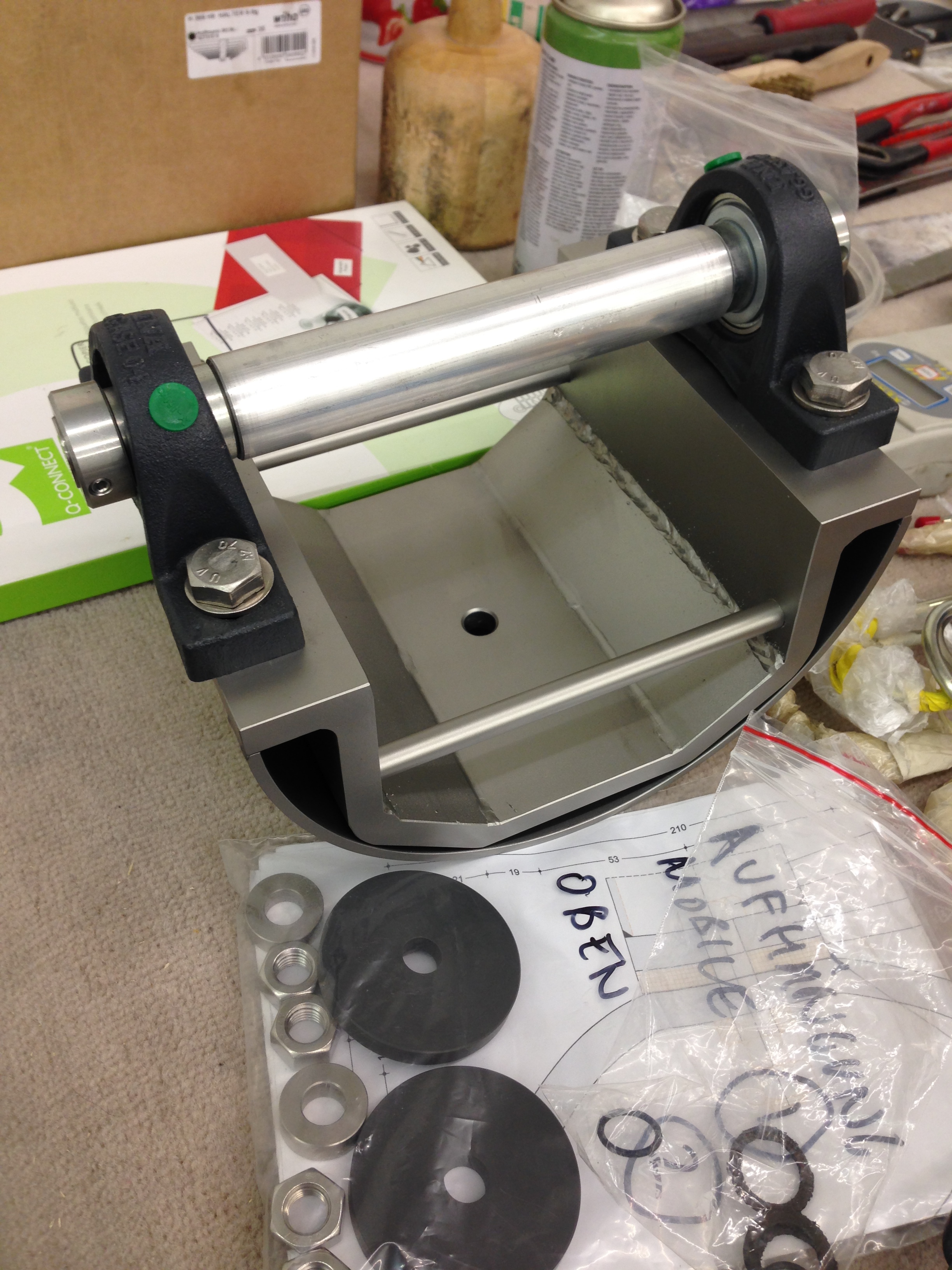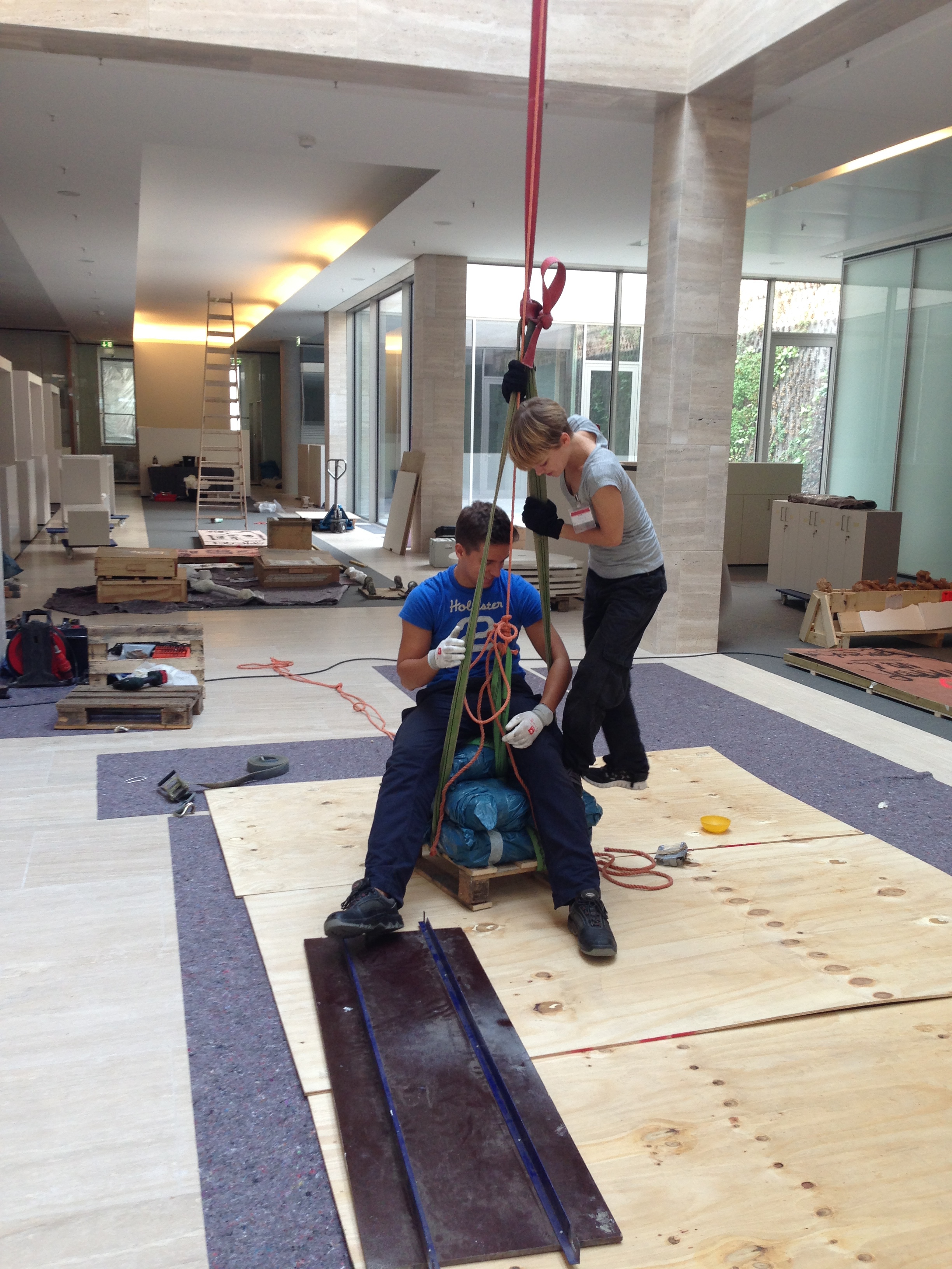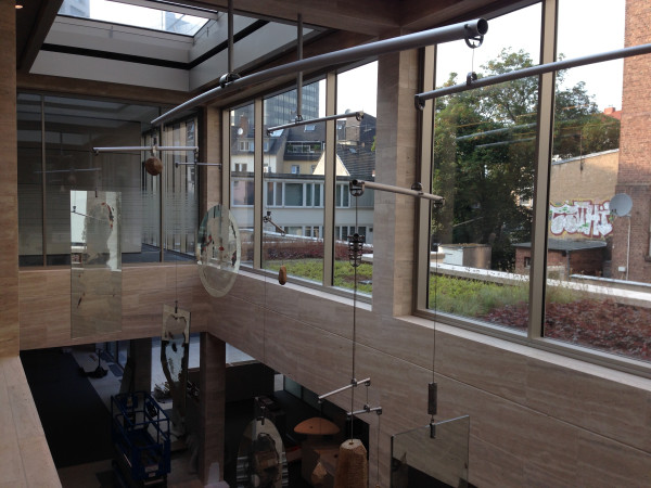 Mobile von Gereon Krebber für die Sparkasse Bonn, Neubau Hauptstelle Friedensplatz. Metall, Spiegel, Beton, 1kg Gold, Zweiteilig.