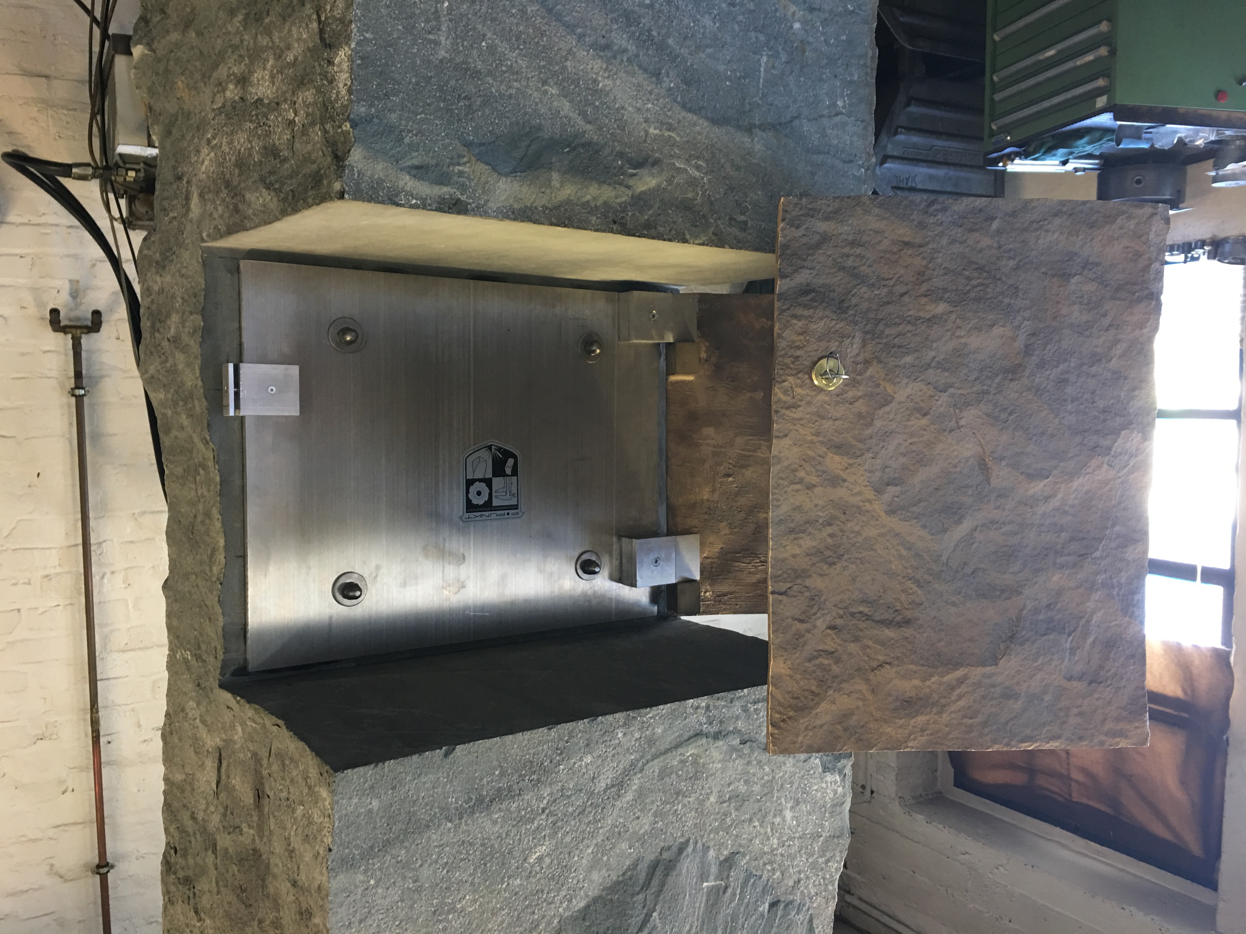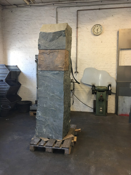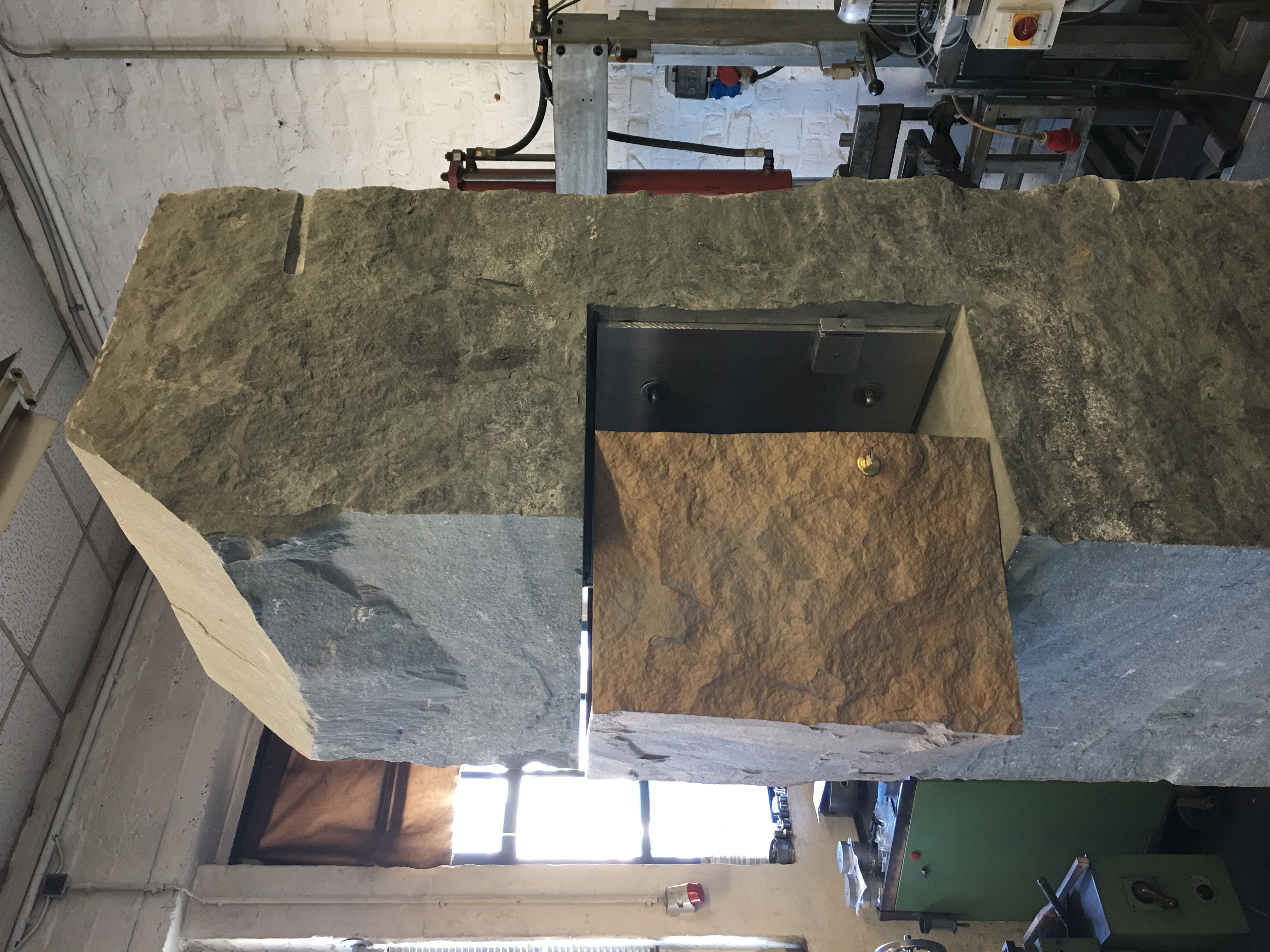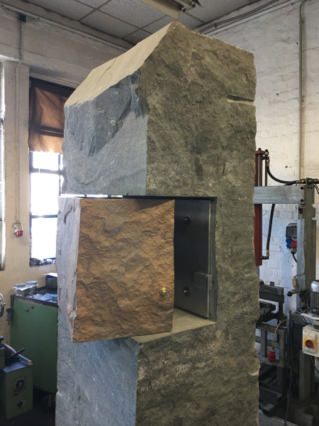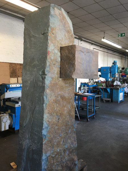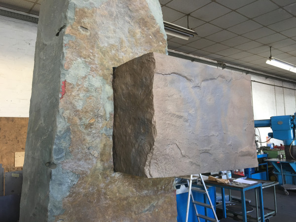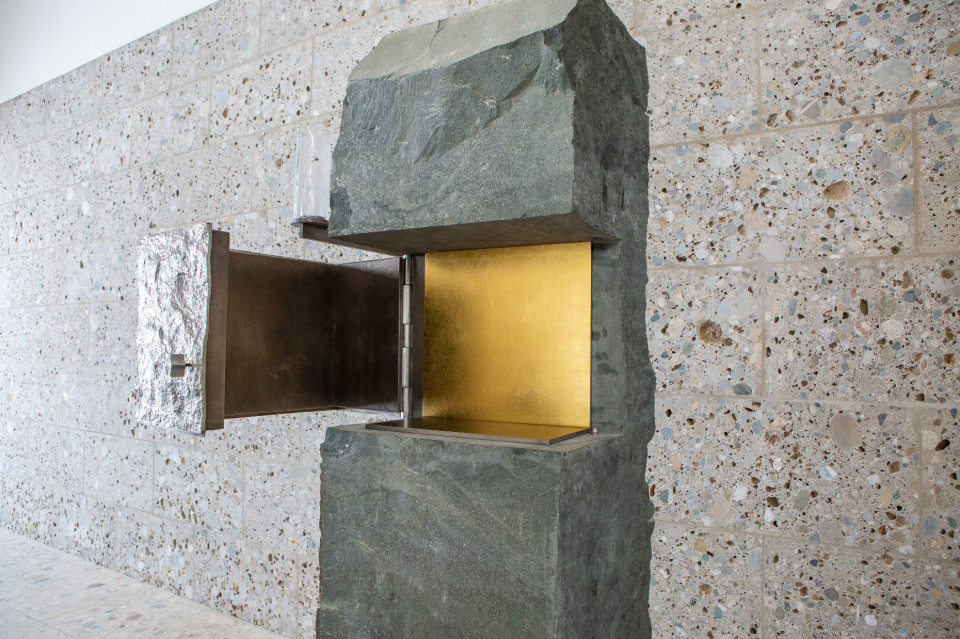 Bronzeguss-Klappe von Abdruck des Original-Steinsegments. Skulptur von Ulrich Rückriem für die Pfarrkirche „Seliger Rupert Mayer“ in Poing.
